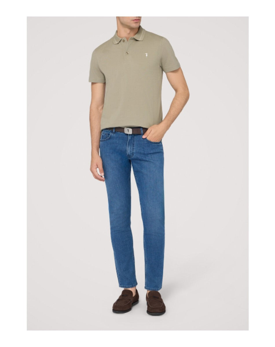 Pantaloni 370 Close a 5 tasche in denim blu super stone wash con lavaggio chimico, toppa in pelle, ricamo Greyhound sul taschino portamonete.