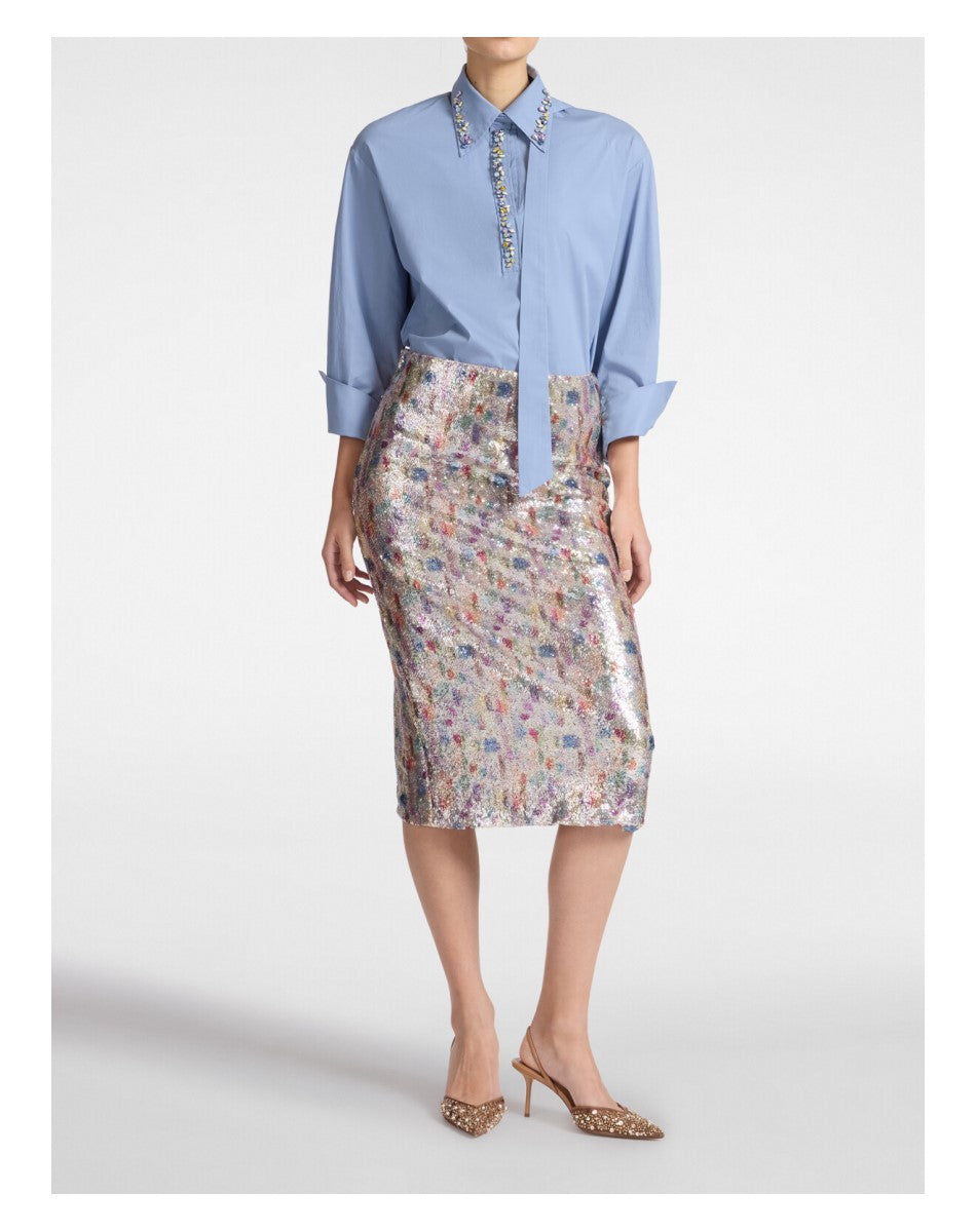 Camicia in popeline di misto cotone dal taglio morbido con cristalli su revers e abbottonatura. La cintura in vita definisce la silhouette. Abbinabile a pantaloni sartoriali o jeans per un look versatile e raffinato.