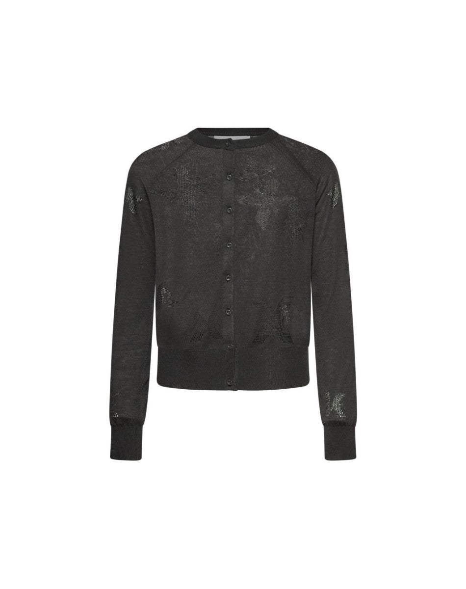 Lightweight black wool cardigan with all-over openwork detailing.