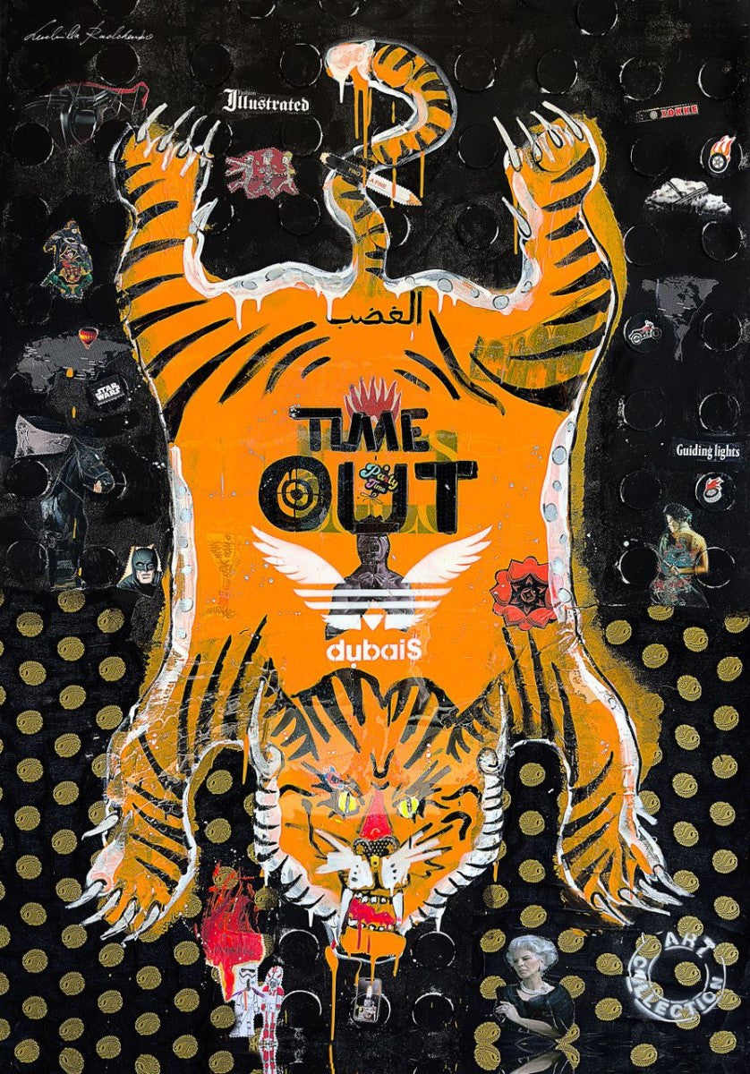 Inspired by the sacred power of the tiger — a creature symbolizing strength, courage, and awakening — each artwork personifies one of the Seven Deadly Sins: Pride, Greed, Lust, Envy, Gluttony, Wrath, and Sloth. Through her signature collage technique, Radchenko integrates original Nepali fabrics and layered iconography to reimagine these human flaws in a contemporary, ironic, and deeply expressive way.