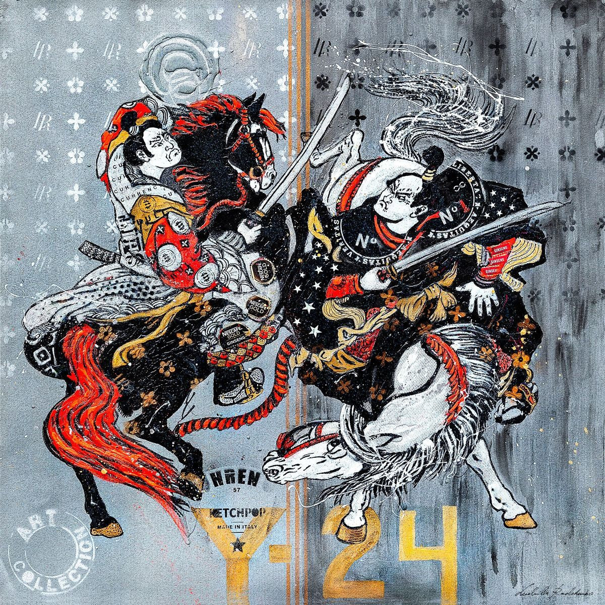 The rectangular scarf "TIGER&SAMURAI", from the collection of scarves designed by Ludmilla Radchenko is an original and unisex artistic scarf made of silk, cashmere and modal, 140x140cm. This scarf is signed Ludmilla Radchenko and reproduction of the homonymous work. Multicolored scarf with pattern completely made in Italy for all casual and formal situations.