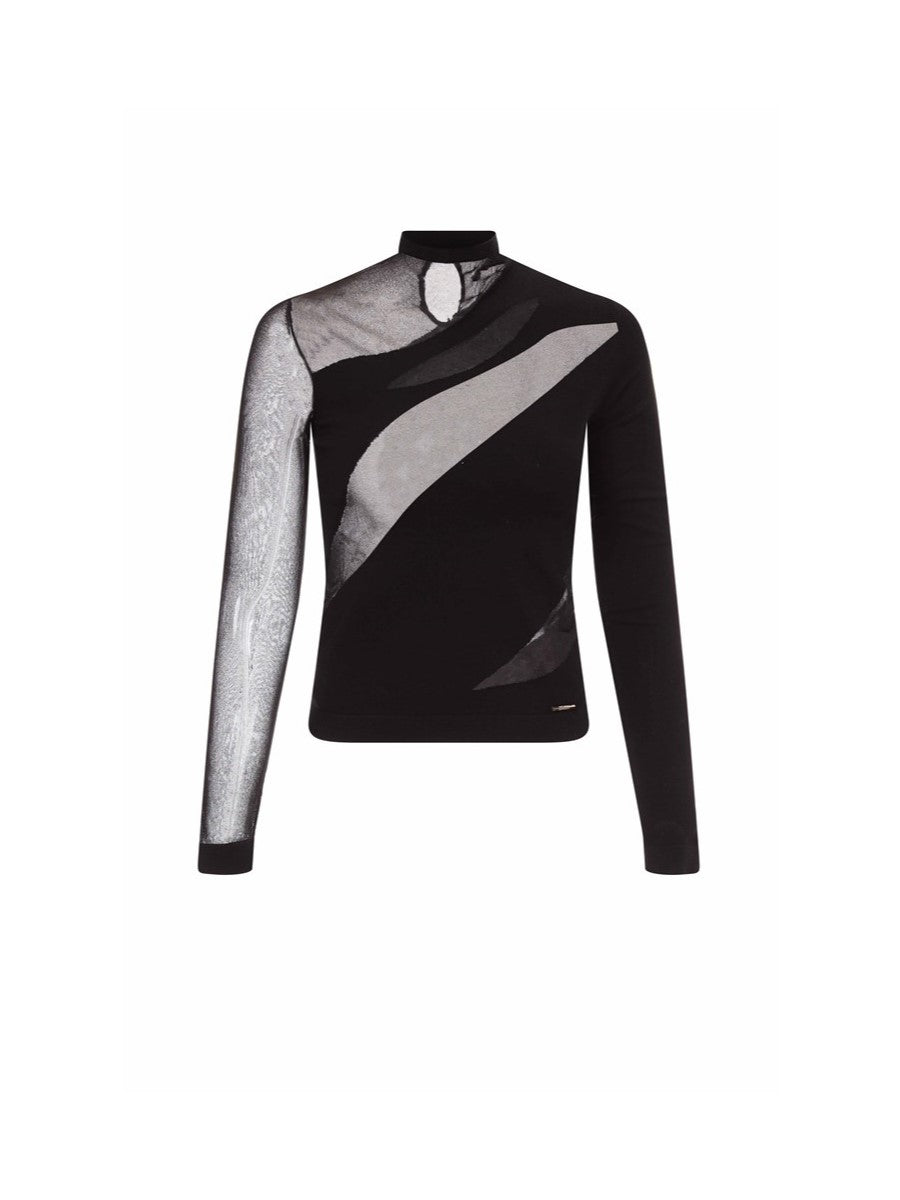 Seductive geometric and sheer detailing animates this refined women's long-sleeved top from Just Cavalli, where the tulle alternates on the front with solid-colored fabric inserts to create a broken-up see-through effect.