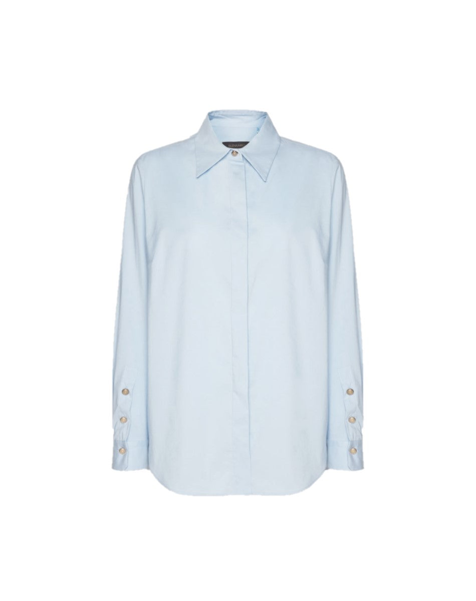 Stretch poplin shirt with hidden button placket featured by cuffs with Monogram buttons and slightly oversized line, perfect for all day long.