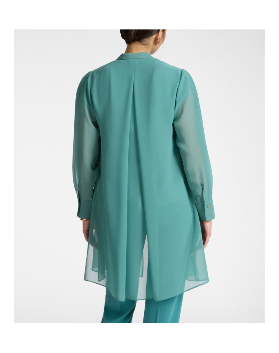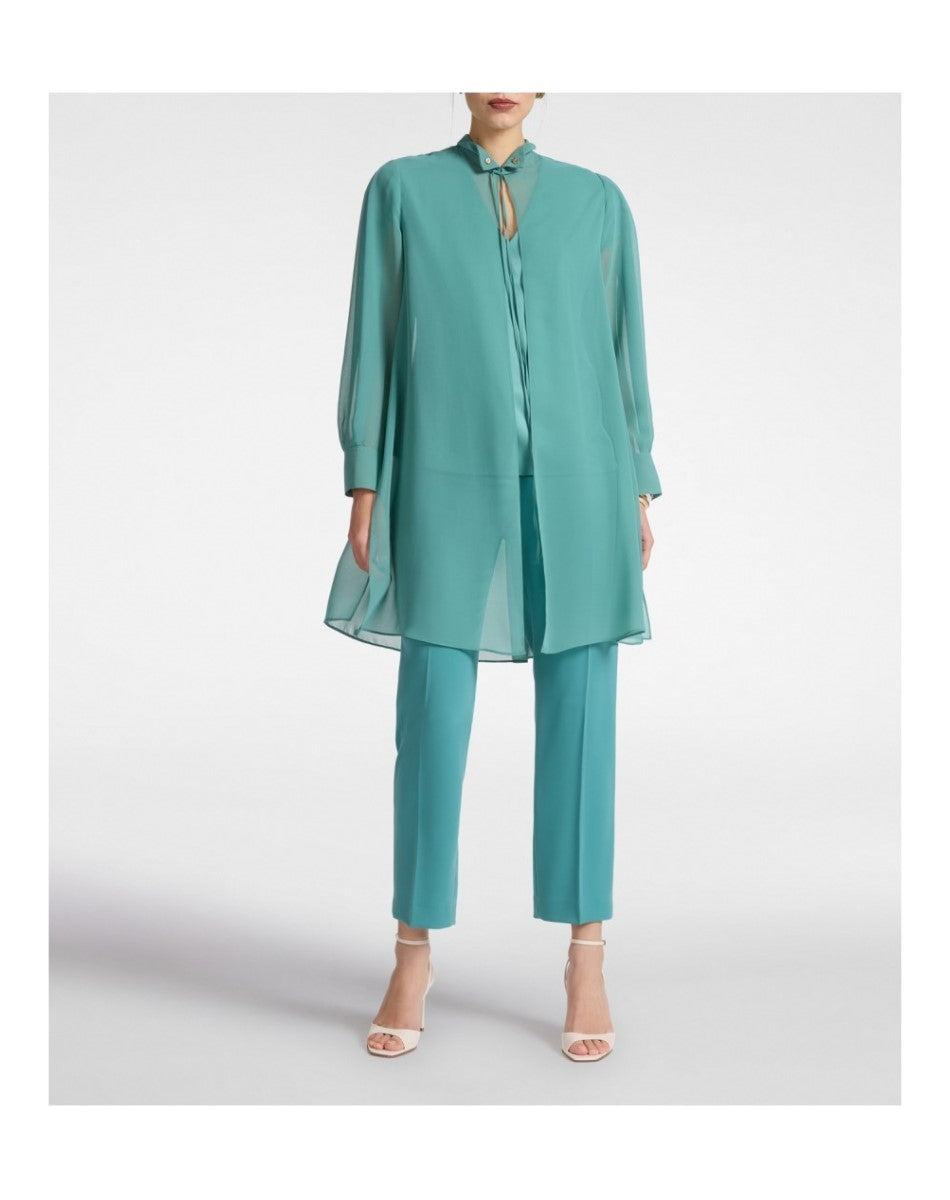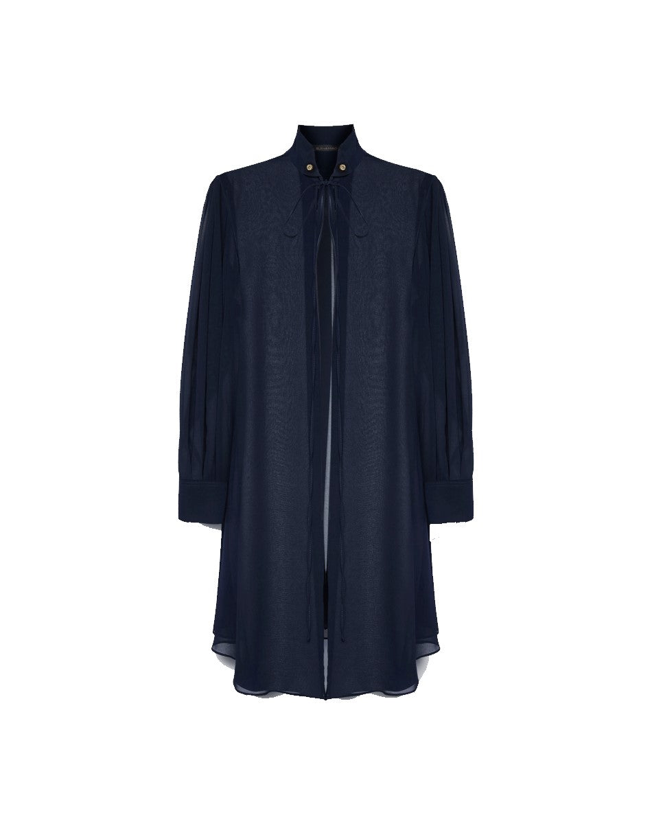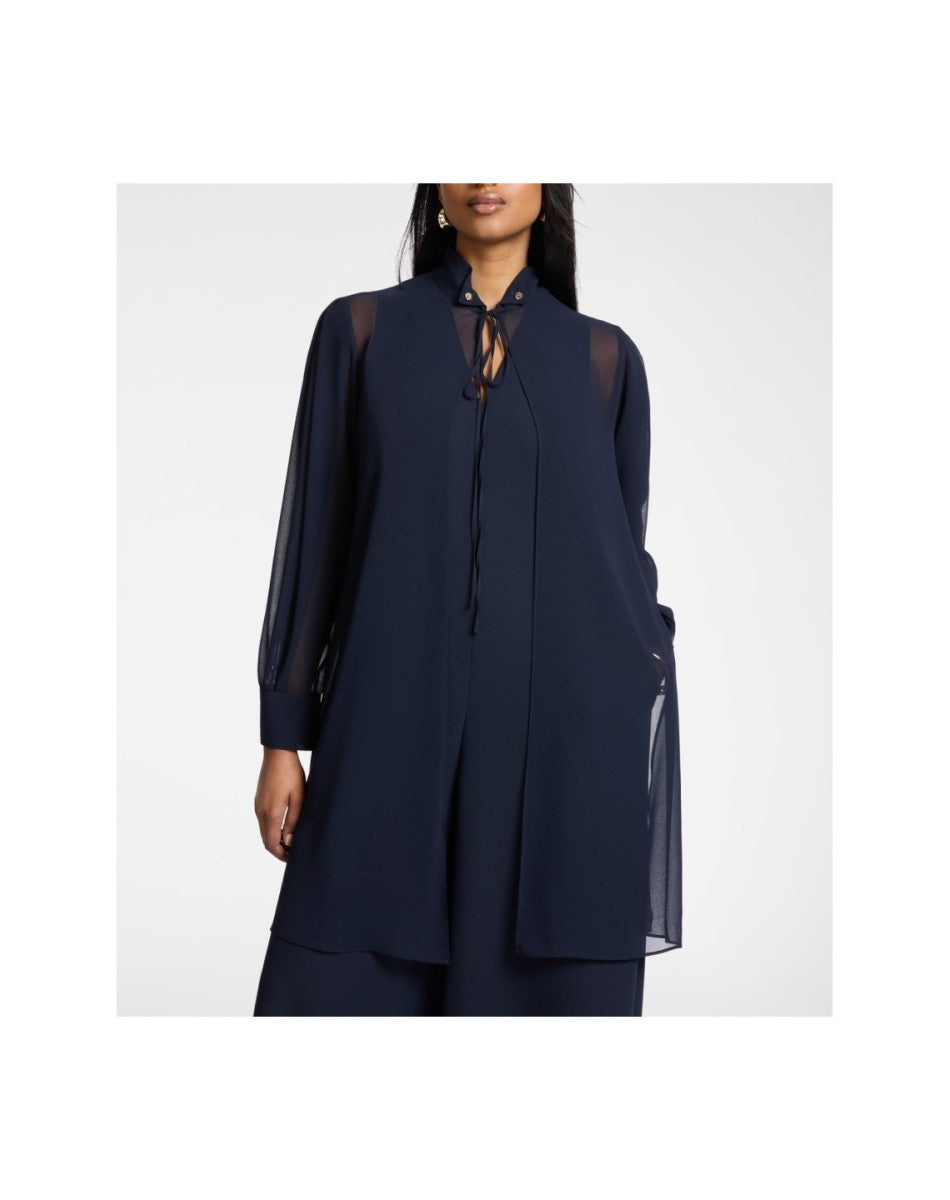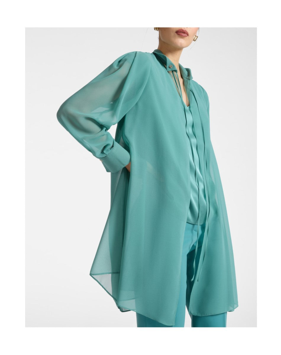Long georgette shirt with collar and tie closure. The embroidered collar adds a refined detail. Versatile from the office to aperitivo with tailored trousers or jeans, or with coordinating trousers for a special occasion.