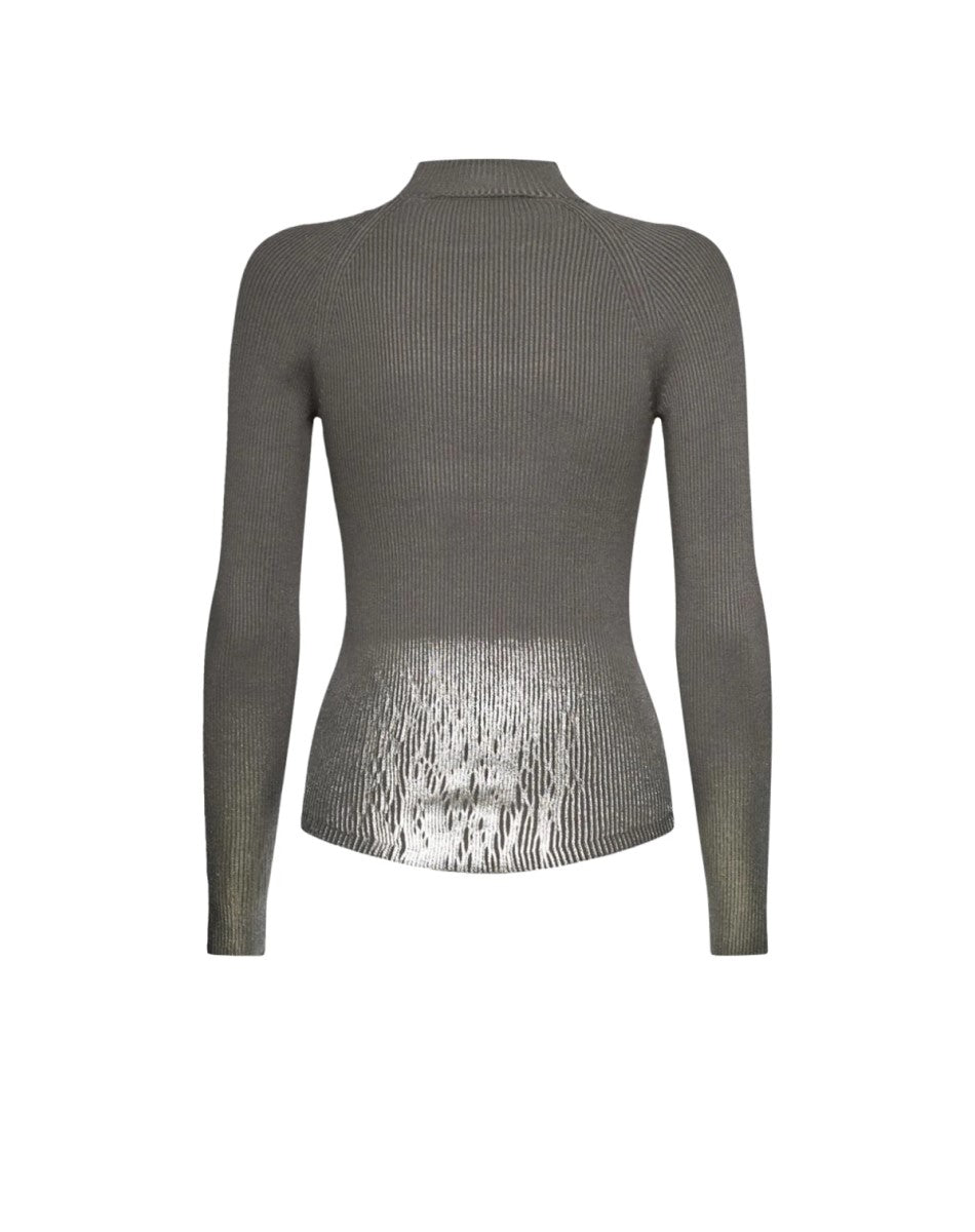 Long sleeve turtleneck in ribbed jersey with laminated degradé effect on bust and wrists. A meter fit, perfect for decisive and sophisticated looks.