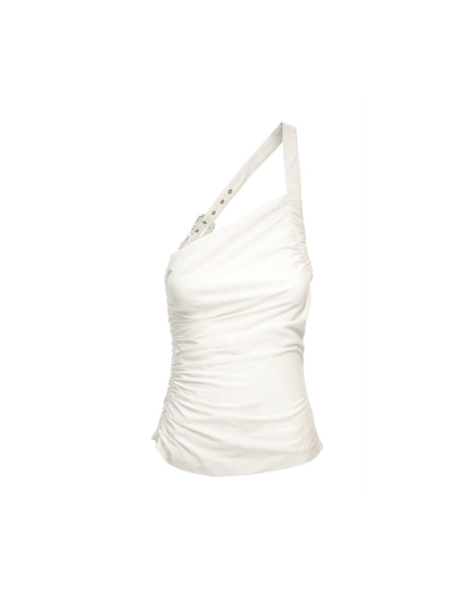 Washed white top featured by a curl side buckles designed by Versace Jeans Couture.